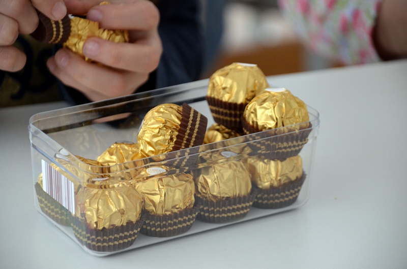Dann fehlen nur noch die Schokostreusel, und fertig ist eure Rocher Torte!